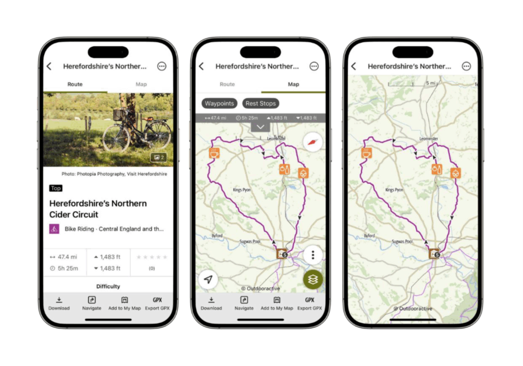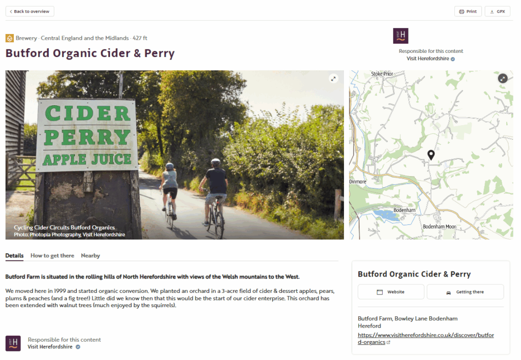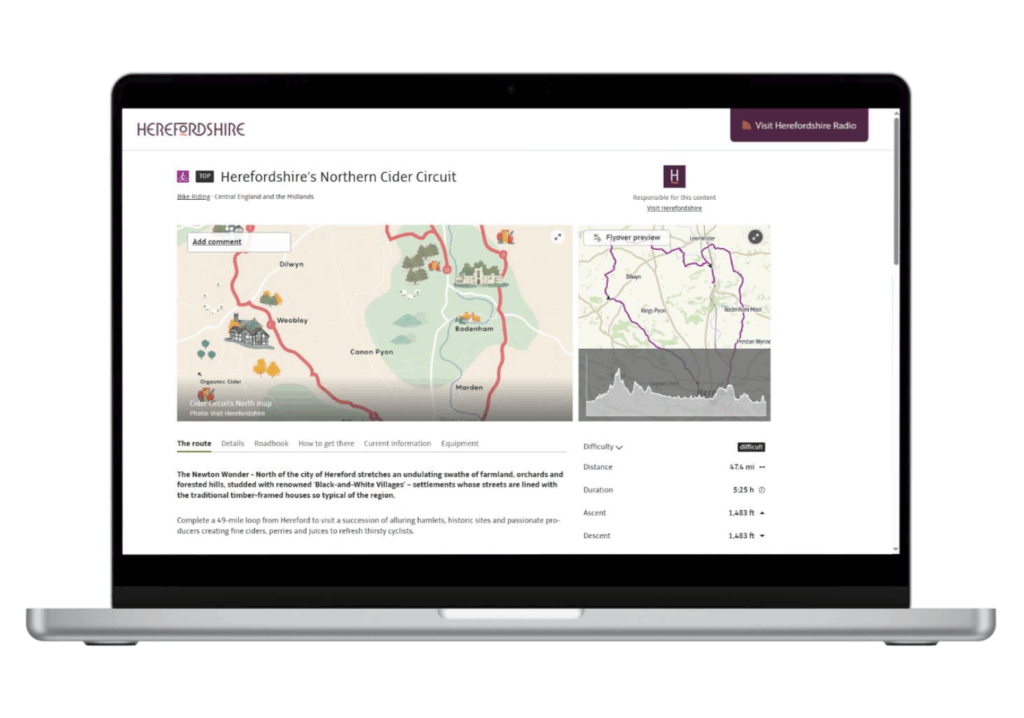 The app connects directly with the Visit Herefordshire website, ensuring consistency and accuracy across platforms. The same content also appears across the wider Outdooractive platform, extending reach beyond the app itself.